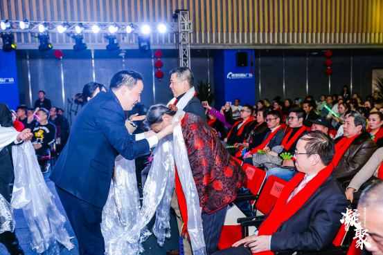 图:唐董事长、严董事长、张总上台向全体员工及来宾送上新年祝福